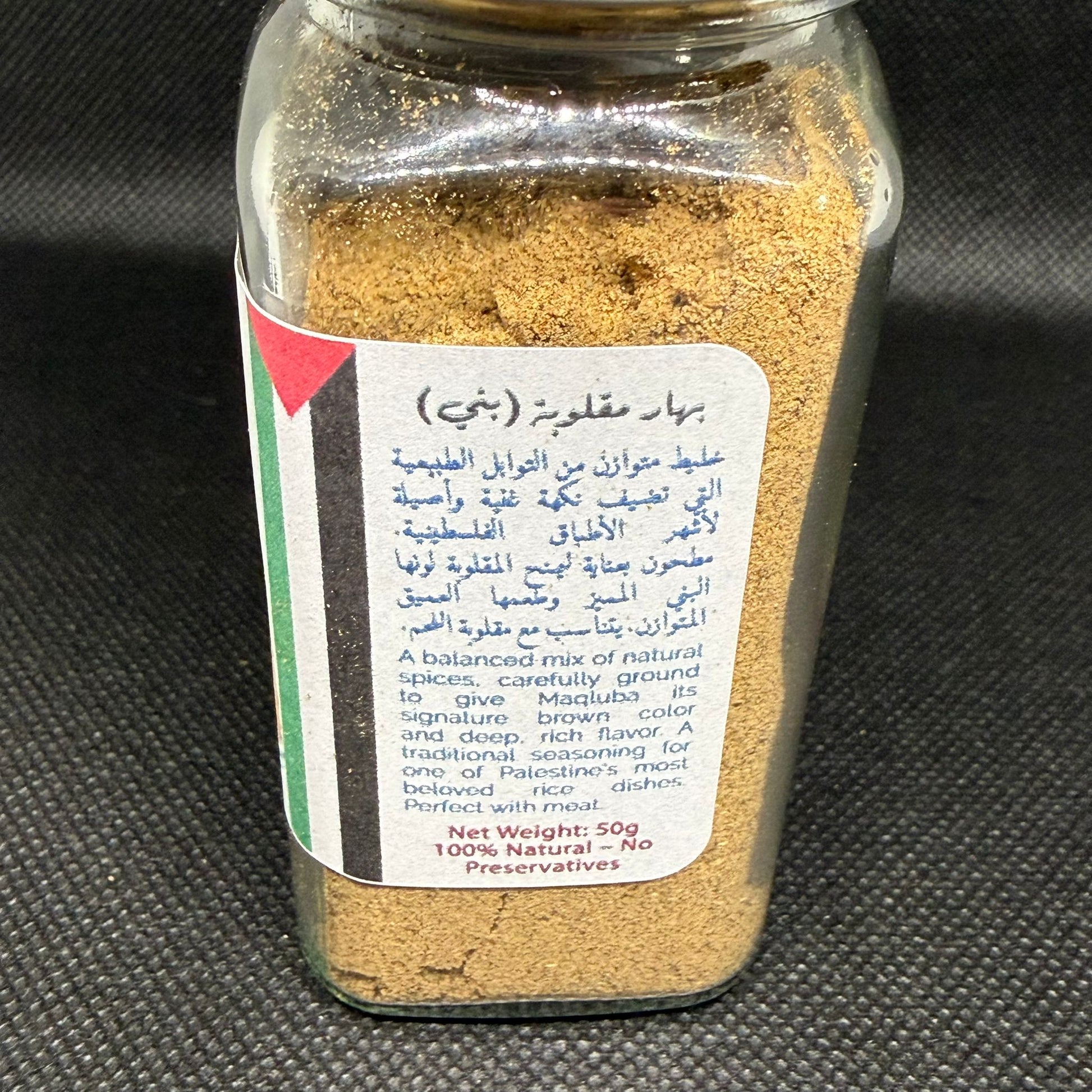Bring the authentic taste of Palestine to your kitchen with our Brown Maqlooba Spice. This perfectly balanced mix of natural spices is crafted to give Maqlooba its signature brown color, deep aroma, and irresistible flavor. A beloved seasoning in traditional Palestinian cuisine, it enhances the richness of rice and pairs beautifully with lamb, chicken, or vegetables.
