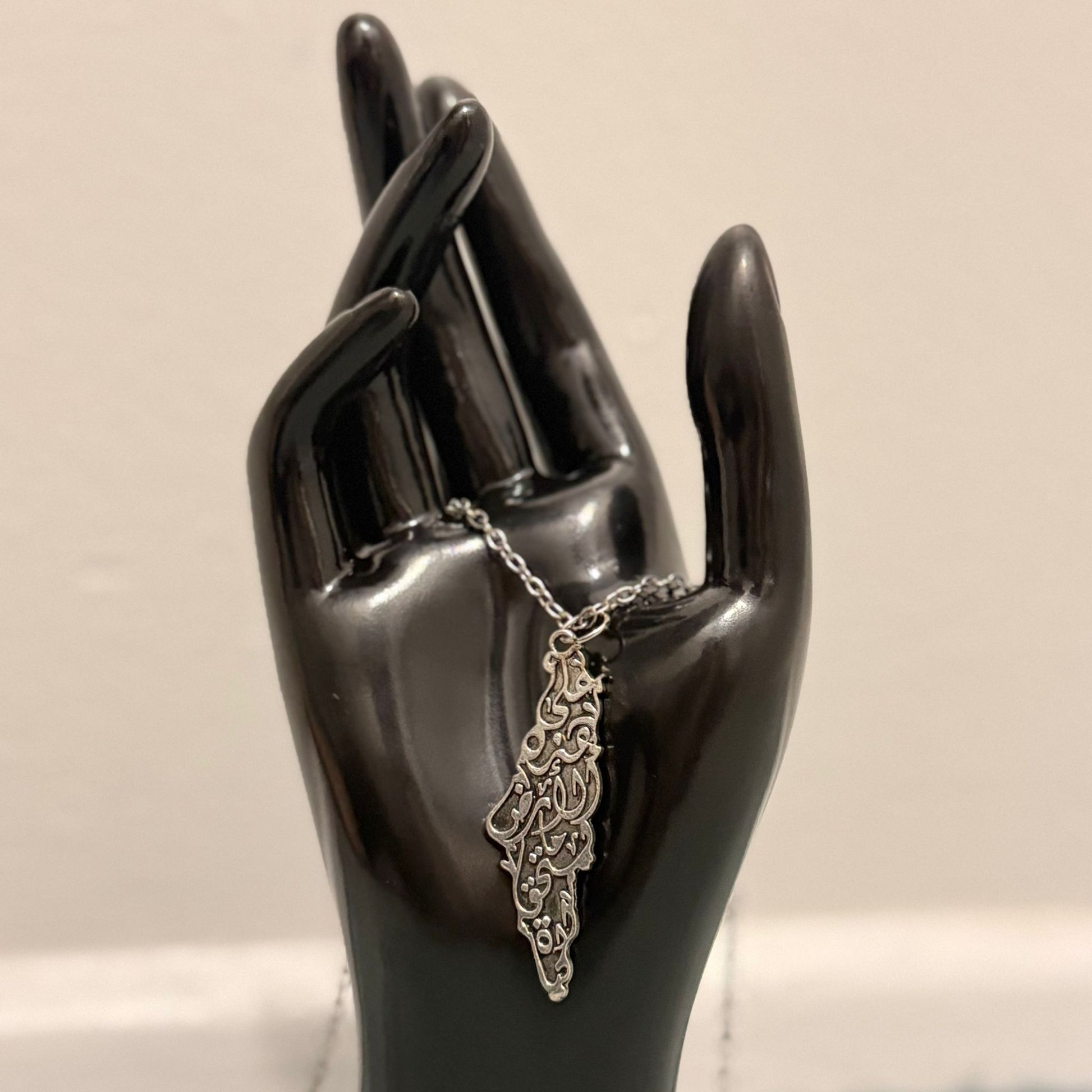 A silver-tone necklace featuring the map of Palestine engraved with elegant Arabic calligraphy. The intricate design blends cultural artistry with meaningful symbolism, making it more than just jewelry — it’s a statement of identity, pride, and heritage. A unique piece to wear daily or gift as a timeless reminder of Palestine.