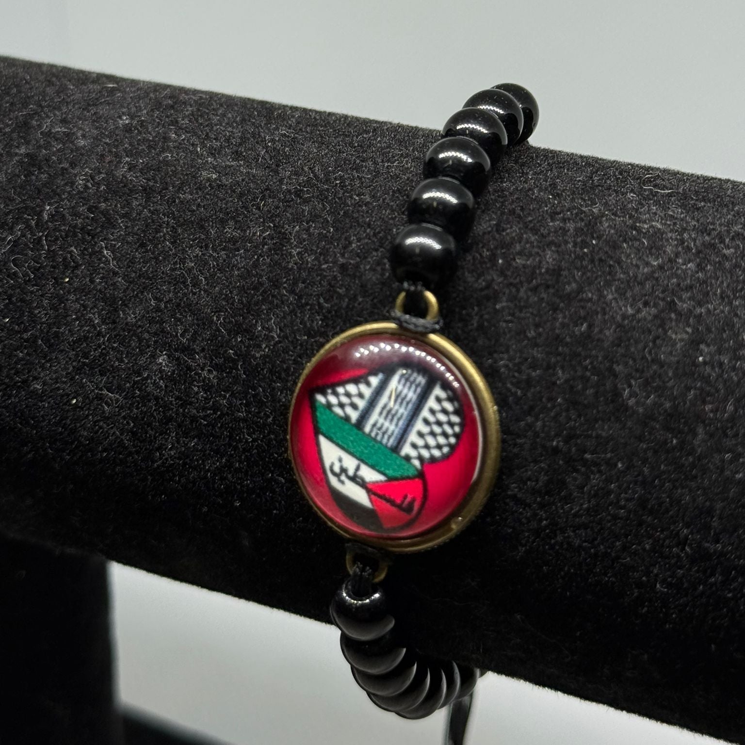 A bold bracelet featuring the Palestinian national emblem with the flag colors, set in a round charm on a sleek black beaded band. Strong, stylish, and meaningful, this bracelet is more than just jewelry — it’s a symbol of pride, resilience, and identity. Perfect for everyday wear or as a meaningful gift to honor heritage.